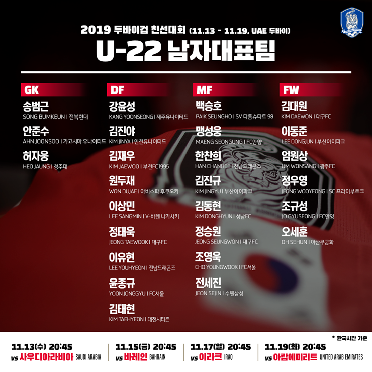 대한민국 축구 국가대표팀 Korea Football Team 도쿄를 향한 질주가 시작된다 2020 도쿄올림픽 아시아지역 1차 예선 겸 Afc U 23 챔피언십 예선에 참가하는 U 22 남자대표팀 명단을 공개합니다 경기일정 V 대만 03 22 금